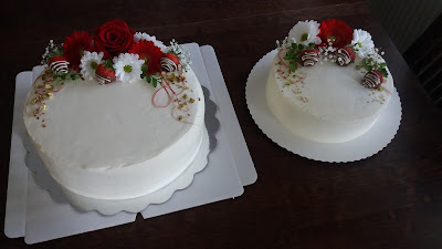 Toisiin juhliin haluttiin kaksi erilaista kakkua; toinen perinteinen mansikkakakku ja toinen massalla kuorrutettu "erikoisempi" kakku. Mansikkakakussa mansikkaviipaleet ja mansikkamousse, massakakussa suklaamousse + pätkisrouhe ja valkosuklaamousse. Massakakun kanssa kävi hiukan nolosti - siihen haluttiin nimi ja päivämäärä. No ne laitoin, mutta heinäkuutahan tässä jo eletään... Tilaajakin tosin tämän minulle vasta juhlien jälkeen nauraen kertoi, että ei sitä ihan heti kaikki olleet huomanneet :)